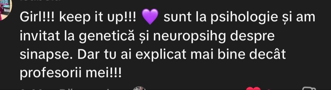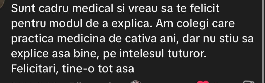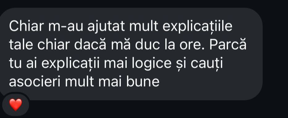 Bună! Mă numesc Delia și sunt studentă la medicină și am pornit pe acest drum din pasiune pentru oameni și pentru știință. Îmi doresc să-i sprijin pe cei care își doresc o carieră în medicină, nu doar prin meditații, ci și printr-o abordare diferită față de ce oferă majoritatea: pun accent pe învățarea logică, pe înțelegerea profundă a conceptelor și nu pe memorarea mecanică. Cred că medicina se învață cu mintea, dar se face cu inima — iar eu sunt aici să te ajut să reușești, pas cu pas, într-un mod clar, structurat și prietenos. Dacă vrei să devii medic, nu ai nevoie doar de informație, ci și de încredere, sprijin și o metodă care să ți se potrivească! 🩺👩🏻⚕️